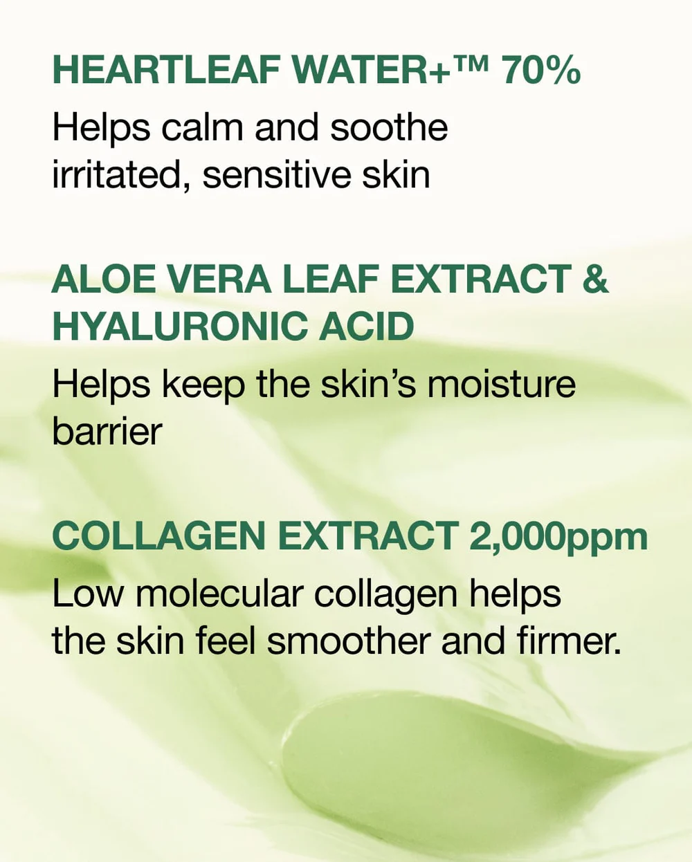 • حاوی ۷۰٪ عصاره گیاه Heartleaf (هوتونیا کورداتا): تسکین‌دهنده قوی پوست ملتهب و رفع مؤثر قرمزی پوست