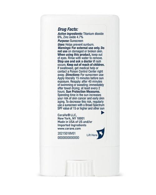 ضد آفتاب استیکی سراوی بی رنگ Cerave Sunscreen Stick آبرسان حاوی مواد معدنی زینگ، سرامید و دی اکسید تیتانیوم است که یک پوشش روی پوست هنگامی که در معرض آفتاب قرار میگیرد، ایجاد میکند. این ضدآفتاب اشعه های مضر UVA/UVB خورشید را منعکس میکند و با دارا بودن اکسید روی و دی اکسید تیتانیوم اشعه های مضر آفتاب را منعکس میکند.